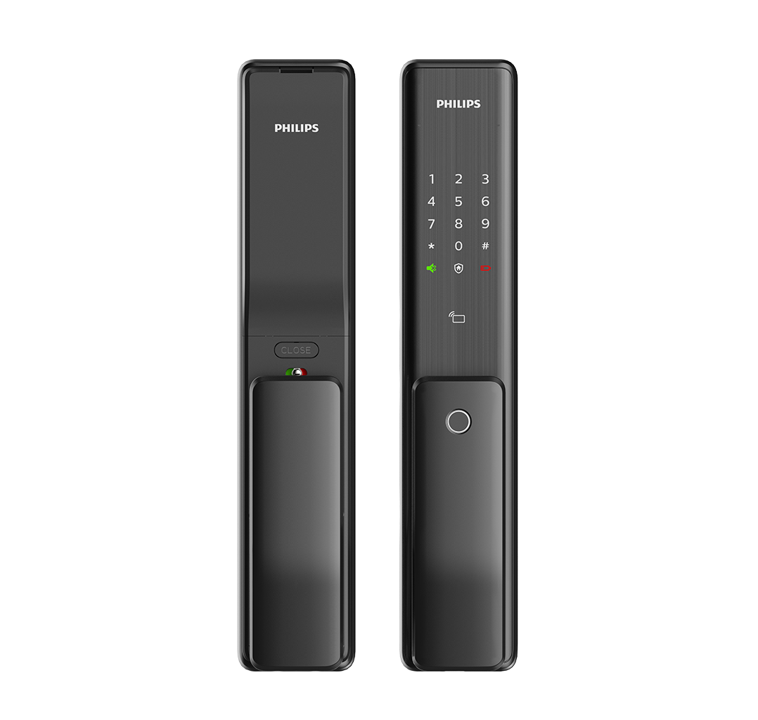 Push-pull premium lock with auto-mortise, fingerprint, PIN, RFID, app/Bluetooth, dual verification, fake PIN, real-time notifications, C-grade cylinder, 9 V emergency port, voice guide, reversible handle, and robust alarms.